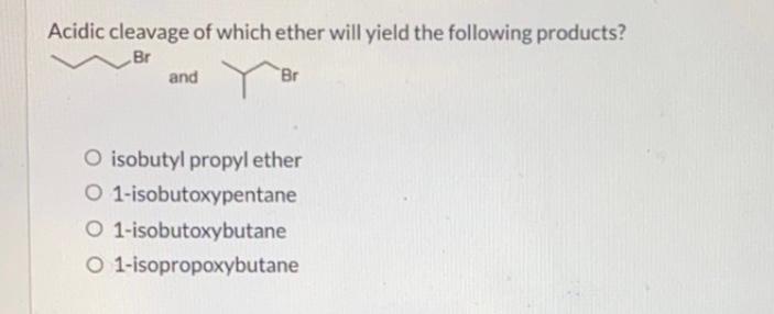 Acidic cleavage of which ether will yield the following products. Correct answer to the question Acidic cleavage of which ether will yield the following products. When hydrogen halides such as hydrogen chloride HCl or hydrogen bromide HBr are used as acid catalysts the location where ether cleavage occurs is determined.