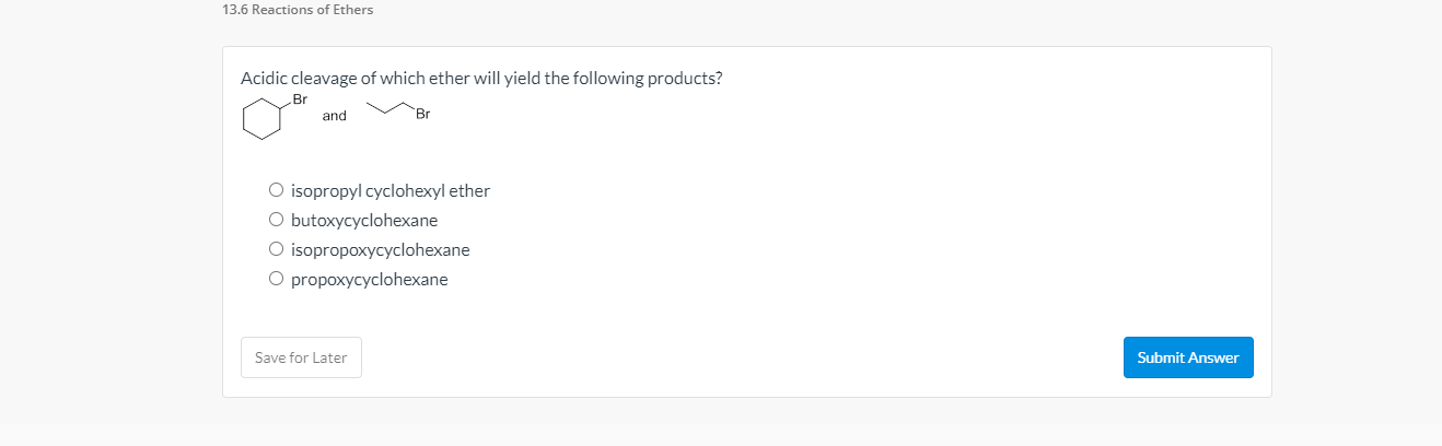 Cleavage of C-O bonds in ether takes place in excess hydrogen halide which are acidic under extreme conditions like in concentrated acids usually HBr and HI and high temperatures. And O isopropyl cyclohexyl ether O butoxycyclohexane O isopropoxycyclohexane. BCl 3 or with I 2 -Ac 2 O.